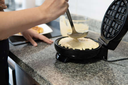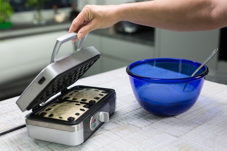 Waffle iron in the kitchen. Preparing homemade waffles, pouring a dough