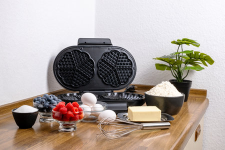 Ingredients for Belgian waffles and waffle maker on kitchen table. Eggs, butter, sugar, flour and whisk for making dough and berries. Making waffles at home