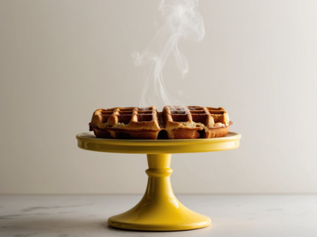 AI Generated. Freshly baked waffle on a bright yellow stand with steamy bubbles rising from the top