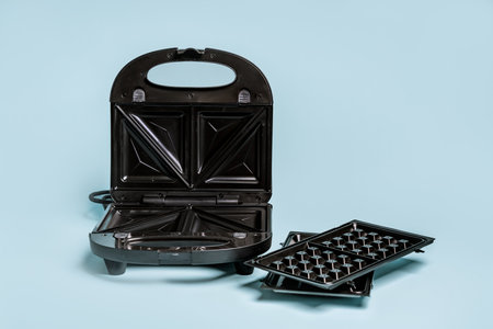 Old and dirty electric kitchen press, open on desk ready for preparing new food.