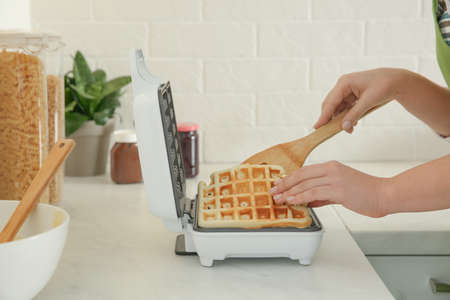 A woman is closing the waffle iron with belgian waffles bin her modern kitchen.
