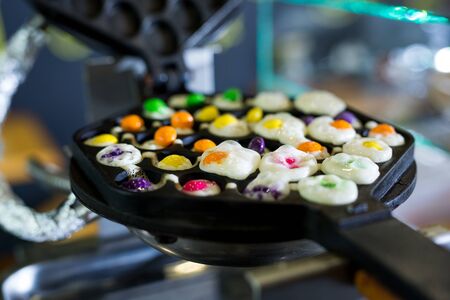 Waffle iron in the kitchen at shop. Preparing Hong Kong waffle.