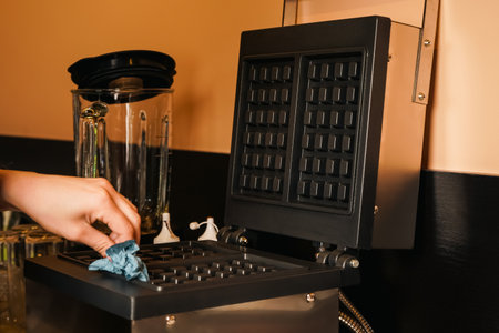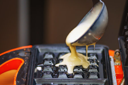 vibrant plastic ladle gracefully pours smooth batter into a sleek electric waffle maker, poised to create golden, crispy delicacies. A moment of culinary anticipation unfolds