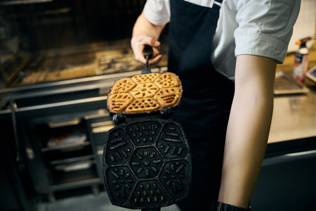 Close up of waffles baked on waffle maker iron machine. Generative AI