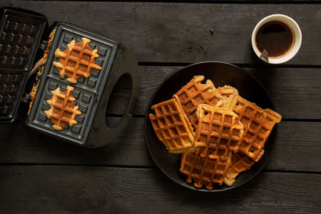 Viennese waffle on a wooden table and a cup with coffee, waffles for breakfast in the kitchen at home