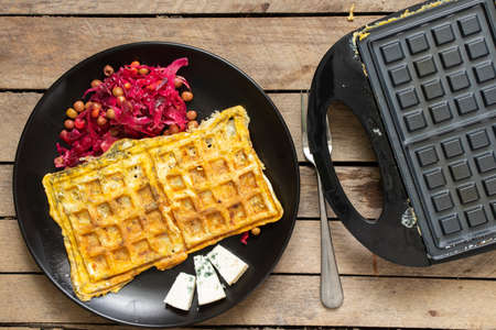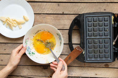 fry scrambled eggs with cheese and spices in a waffle iron on a wooden table in the kitchen, boil scrambled eggs in a waffle iron, breakfast