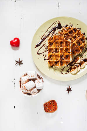 Belgian waffles and cocoa with marshmallows for breakfast. Top view