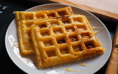 delicious waffle on a dish at wooden desk