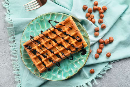 Plate with delicious Belgian waffle, chocolate sauce and nuts on light background
