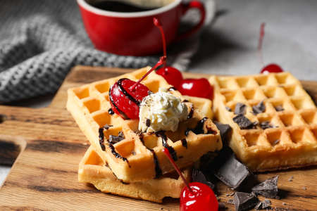 Wooden board of tasty Belgian Waffles with cherry on table