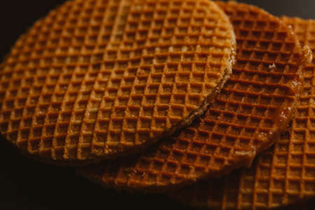 fresh waffles with caramel cookies on a black background.