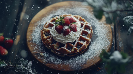 This enticing image showcases a beautifully plated waffle, adorned with luscious whipped cream and ripe strawberries, perfect for a cozy winter breakfast.