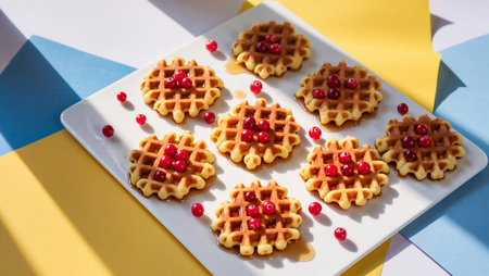 Delicious homemade waffles lined with bright red berries await a tasty moment.