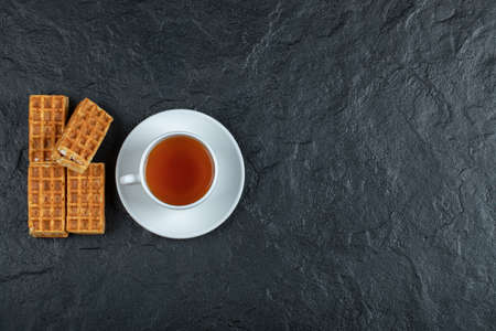 Delicious waffles with a cup of aroma tea on dark surface