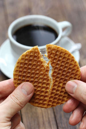 stroopwafel split by hands, dutch snack and coffee
