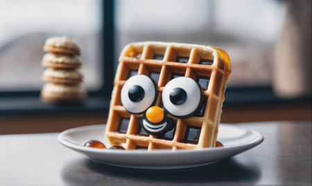A waffle with googly eyes and a smile sits on a plate with a drizzle of syrup