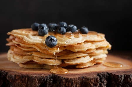 Close-up of soft Viennese waffles with blueberries and honey
