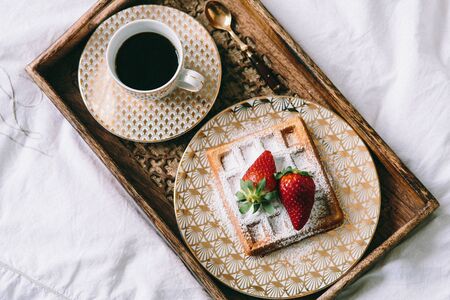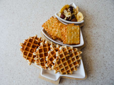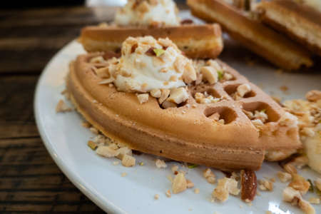 delicious waffle on a dish at wooden desk