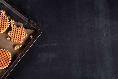 Waffles on baking paper on blackboard from the top
