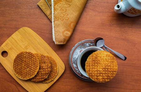 Aerial shot of a group of stroopwafels with a cup of coffee, spoon and napkin