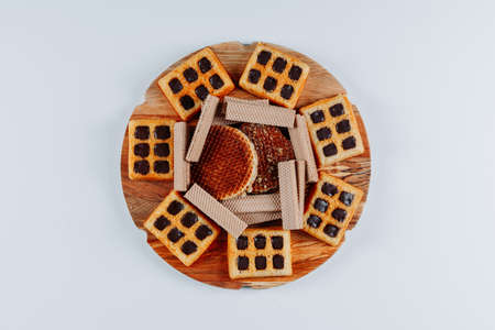 Waffles in a wooden trivet with cookies top view on a white background