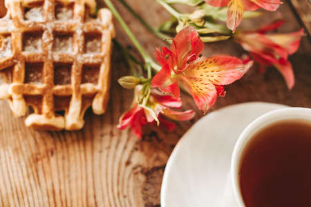 cup of tea and flowers. alstroemeria and a cup of tea. Viennese waffles on a wooden background. morning breakfast. beautiful still life