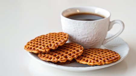 A delightful and tempting arrangement of waffles and a cup of coffee, ready to be enjoyed. This still life image captures the perfect moment for a quick and satisfying snack.