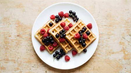 Waffles with fresh berries on a white plate on a wooden background