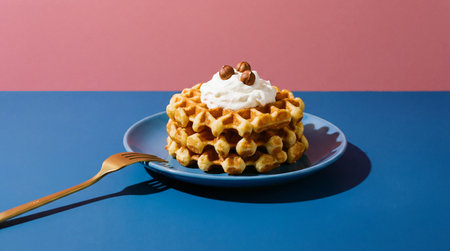 Belgian waffles with whipped cream on a blue and pink background