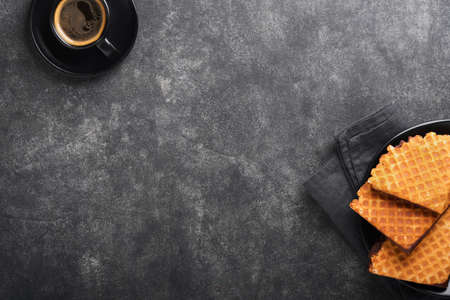 Coffee and dutch waffles. Espresso coffee and dutch waffles or syrupwaffles cookies with chocolate on old on black concrete table. Perfect syrupwaffles cookies for Breakfast . top view. Mock up.