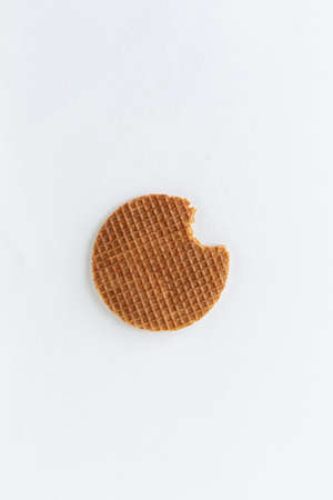 A delicious single Dutch stroopwafel (syrup or caramel waffle) with a bite out of it on white background