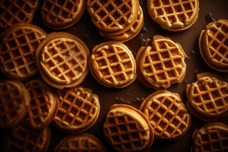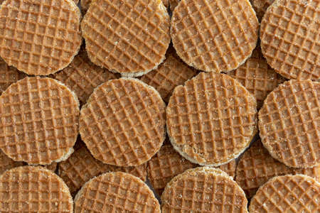 Full frame background of many Dutch syrup waffle cookies (translation: stroopwafels) from above