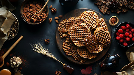 waffles on a dark wood background, striped waffles, waffles and crumbs on the table, belgian waffles
