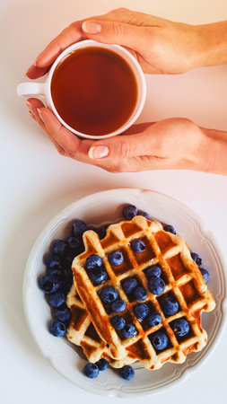 A close-up shot of stacked golden waffles topped with fresh blueberries, served with a steaming cup of tea held by two hands.