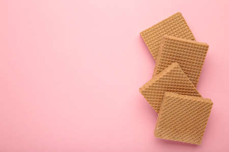 Square chocolate wafer biscuits on pink background. Top view.