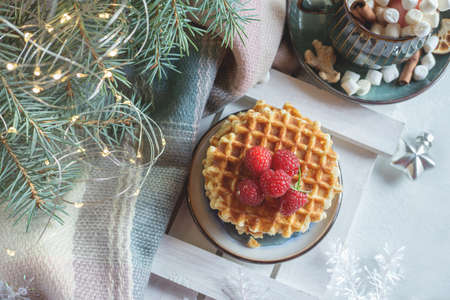 round waffles with raspberries on the Christmas table. Festive pastries on the background of a Christmas tree. Copy space banner.