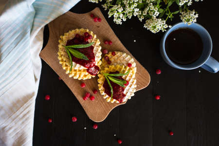 Waffle with berry jam, powdered sugar and mint on black background