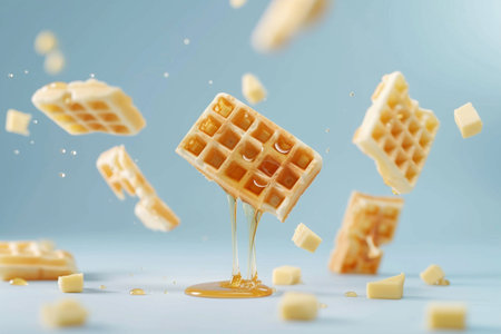 Flying belgian waffles with honey on blue background. 3d rendering
