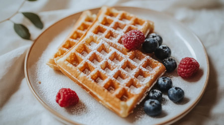 A plate of crispy waffles dusted with powdered sugar, garnished with blueberries and raspberries, beautifully arranged against a bright white backdrop.