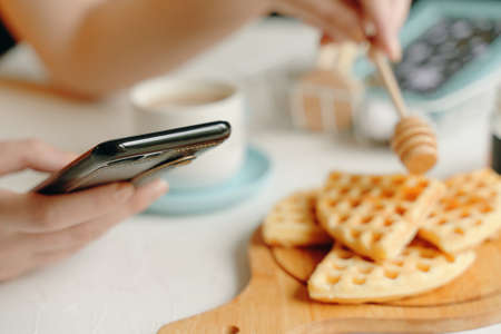 Morning romantic pastime. Person writes messages on cell phone and breakfast. Online communication over lunch. Belgian waffles on desk, cup of coffee and honey stick on white table. Business lady.