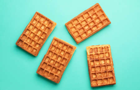 baked round waffles on a white turquoise background copy space