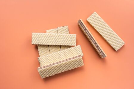 Flat lay photo of wafer cookies scattered on red background.