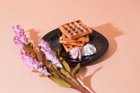 Sweet delicious dessert, homemade baked goods for breakfast. Belgian European soft waffles on a black plate and meringue