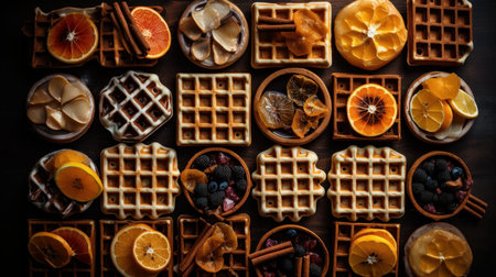An AI generated illustration of a freshly prepared breakfast of waffles and assorted fruit on a table
