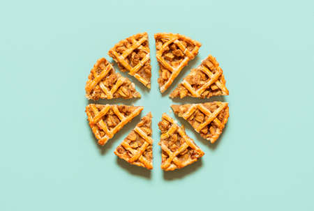 Apple pie cut into slices, isolated on green-mint seamless background. Flat lay with homemade apple pie slices. Traditional tart with a lattice crust.