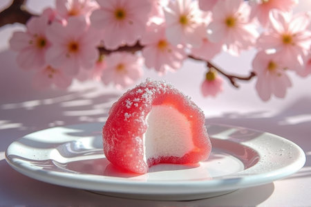 Delicate cherry blossom sakura mochi dessert on elegant plate. That the image is generated using AI.