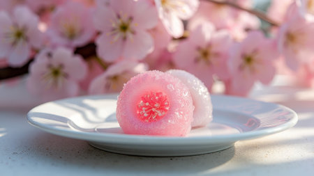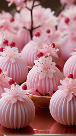Cherry blossom sakura mochi close-up with pink flowers in background. That the image is generated using AI.