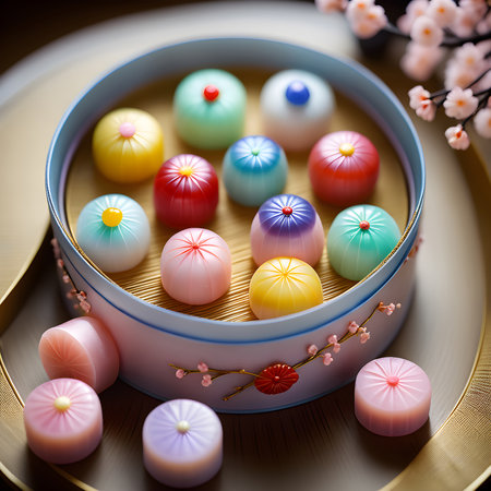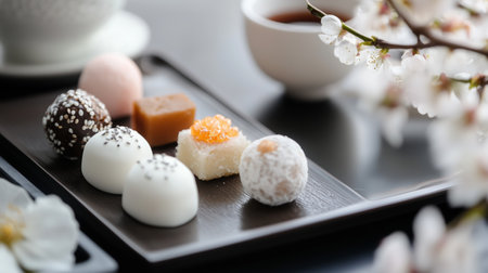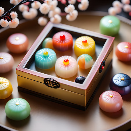 Capture the beauty of traditional Japanese sweets displayed elegantly on a wooden tray, surrounded by delicate cherry blossoms, showcasing artistry and culture.