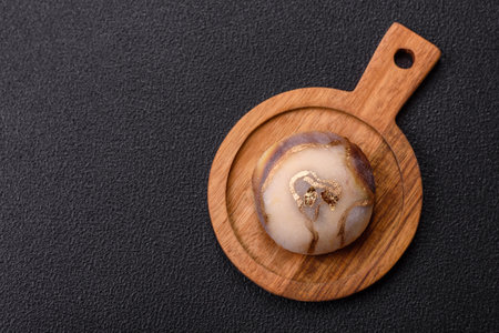 Delicious cold Japanese mochi dessert with colorful rice dough shell and fruit filling on dark concrete background