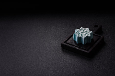 Mochi, mooncake, or cheesecake shaped like a snowflake, an Asian dessert with a fruit filling. Mochi or cheesecake as a food background for your design.